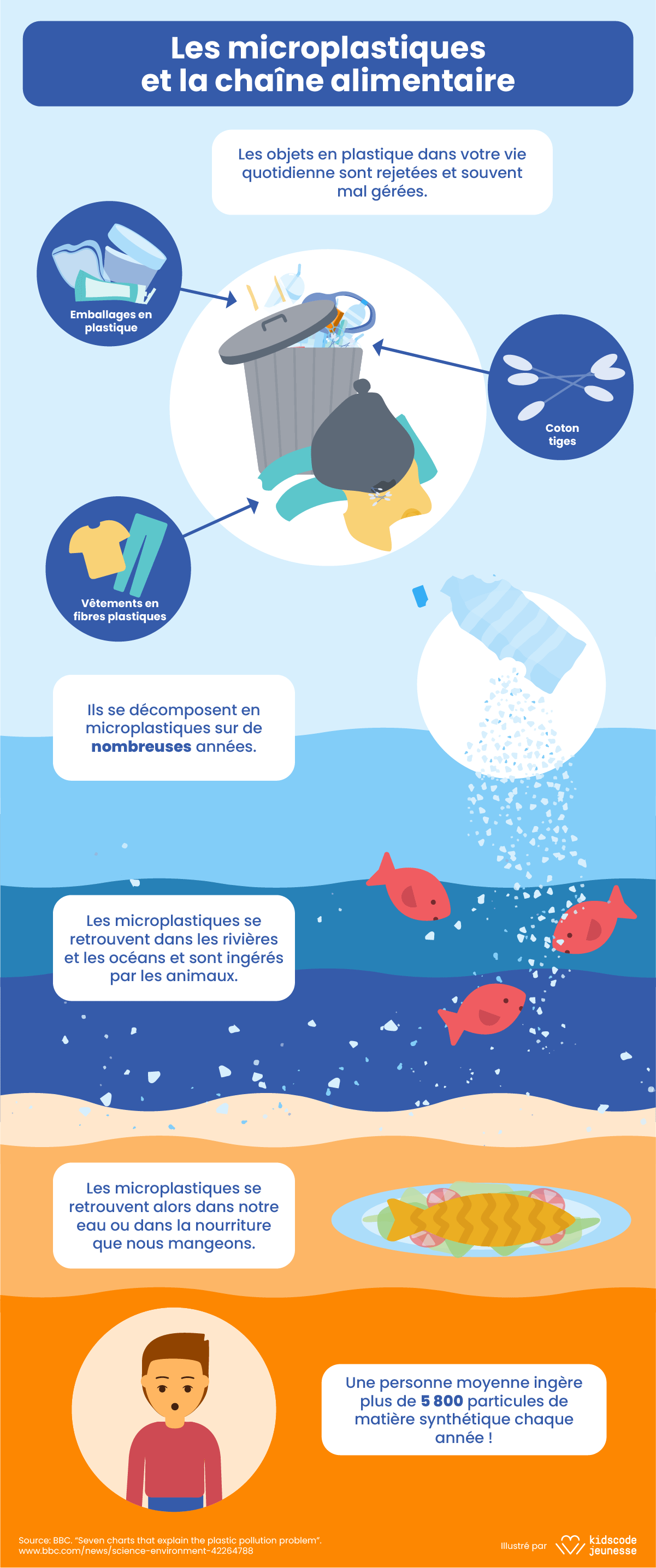 Tu viens d’apprendre que l’océan est plein de macroplastiques qui se décomposent en microplastiques — voyons comment cela t’affecte. Les microplastiques sont des substances toxiques qui finissent dans l’estomac des oiseaux de mer, des poissons et même dans le sel marin!