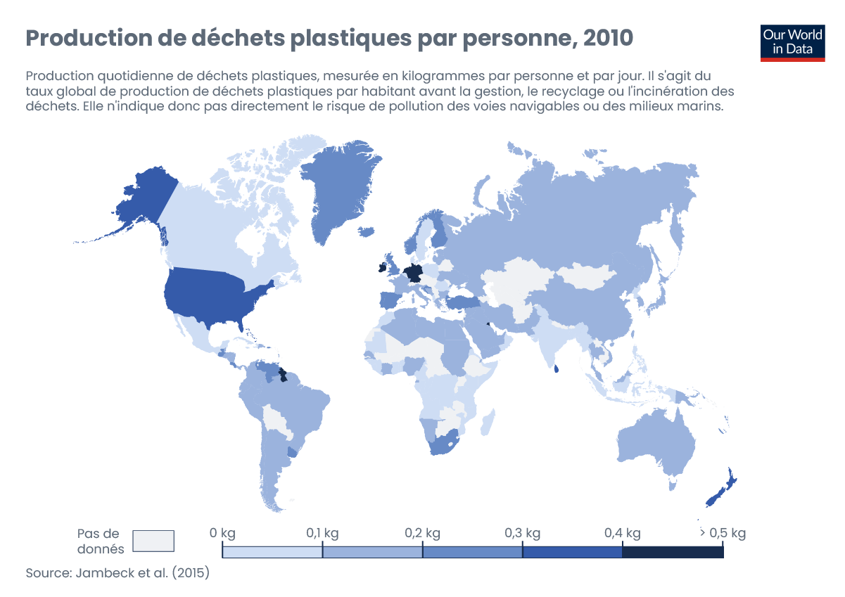 Quels sont les pays qui produisent le moins et le plus de déchets par personne? Pourquoi penses-tu que les pays non côtiers semblent produire beaucoup moins de déchets plastiques?